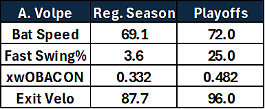 He saw his walk rate decline from 8.7% to 6.1%, hurting his ability to get on base and virtually nullifying the improvement he made to his batting average. Furthermore, Volpe’s power regressed dramatically, and the Yankees were looking at a slap hitter who didn’t have great discipline and was closer to league-average in terms of contact rates. The postseason has seen some notable changes in his approach, as he seems to be letting the ball travel deeper in the box.