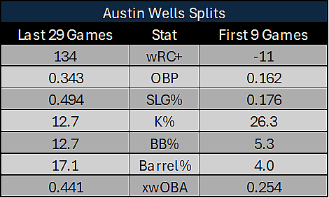 The first thing that stands out from what Austin Wells did last year and this year is the decrease in Chase Rate, as he expanded the zone 37% of the time in 2023 but cut that number down to 22.1% in 2024. He was always a patient hitter, but it seems he was overly aggressive to try and force some action, especially with his slump upon being promoted. In Wells’ first nine games, the left-handed hitting catcher had just four hits in 38 plate appearances, striking out 26.3% of the time.