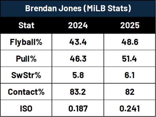 Despite hitting more flyballs and pulling the ball more, Brendan Jones has seen nothing more than a minor decrease in contact abilities, but his power numbers have been much better. This reminds me of what they did with infielder Caleb Durbin, who’s now with the Brewers, as he went from a slap-hitting utilityman to a hitter trying to pull the ball in the air for damage contact. Durbin may never hit 20+ home runs in the big leagues, but he could be a solid hitter with a great glove in the infield, which is valuable at a pre-arbitration cost.