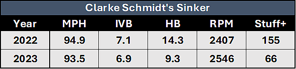 Given the fact that Clarke Schmidt has a much deeper repertoire than just a sinker-sweeper now, the effectiveness of his sinker in these matchups would be even greater than it was in 2022, as batters can’t just sit on one of two pitches. If the pitch starts outside you know it’s a sweeper, if it’s inside you know it’s a sinker, there’s a reason why batters only chased at 27.6% of pitches against Schmidt in 2022. That number improved in 2023, and I think the cutter played a huge role in that development.