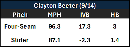 While his high release height makes the movement of his fastball rather predictable, the ability to consistently sit in the upper 90s and pair it with a slider that moves as much as he does vertically is excellent. When his fastball and slider are on batters have little chance of doing anything against him, and we’ve seen a small but important change in the way he delivers the ball. Instead of working out of the windup, Clayton Beeter goes from the set with no one on, and the results have been pretty encouraging thus far.