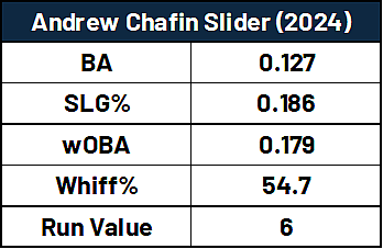 Andrew Chafin was in the 96th Percentile in Whiff% and the 97th Percentile in Chase% this past season as he was able to consistently get batters to come up empty on swings or expand the strike zone, but his numbers plummetted after being traded to the Rangers. His velocity came down a bit with Texas, which the Yankees will hope to correct as they’ve been able to help pitchers improve or better maintain their velocity under Sam Briend and Matt Blake.