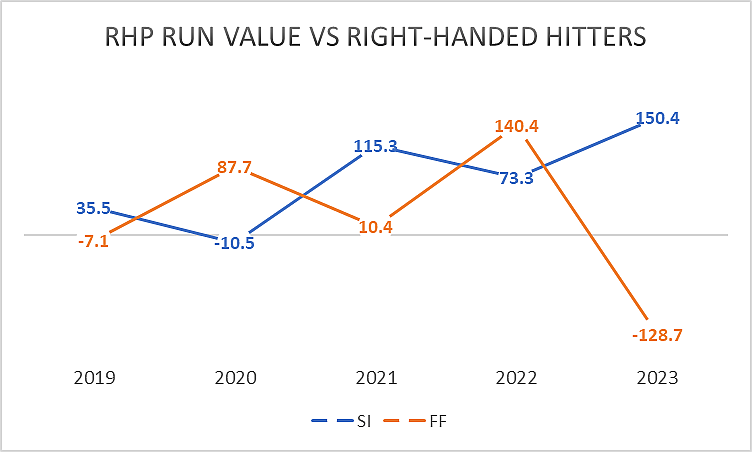 As mentioned earlier, having two fastballs also helps with varying looks and platooning pitches based on the situation, as right-handed sinkers tend to play better against right-handed hitters, while right-handed four-seamers play better against left-handed hitters.