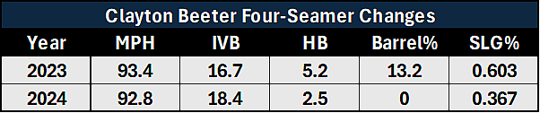 Clayton Beeter’s four-seamer spins at a 12:34 axis while the slider spins at a 6:38 axis, mirroring each other nearly perfectly. Hitters are lost trying to pick up his pitches, resulting in a 32% Chase Rate through his first five starts. In 2023 he struggled to generate swings out of the zone because of how erratic the control was, but the tweaks he’s made to tighten up the spin profiles and generate more carry on the heater have made a massive difference. He’s pitching to a 2.74 ERA and 2.33 FIP in the same run environment that has sported an average ERA north of 5.00.