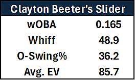 His high release height makes the riding action less deceptive, but it works as a pitch that he can establish at the top of the zone to set up his nasty slider. We’ve also seen Clayton Beeter toy around with a curveball, which has more drop than this slider at a lower velocity, and it could be a good way to steal strikes early in counts or get chases against lefties, who he’s remedied a lot of his problems with. The former second-rounder is lethal against both left-handed and right-handed batters, and while I don’t know if he could make it as a starter due to his command, he could crush it as a reliever.