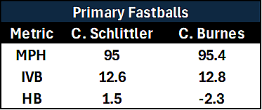Obviously I’m not claiming that Cam Schlittler’s fastball is as good as Corbin Burnes’ cutter, but the fact that they share similar movement and velocity profiles is interesting. Having a primary fastball that plays like or just is a cutter allows for some more damage prevention, but when it generates a decent amount of ride it’s also a quality swing-and-miss offering. The ability to combine strikeouts and damage prevention can create an extremely high ceiling for a pitcher, and Schlittler was one of the best pitchers in Minor League Baseball at meshing both skills.