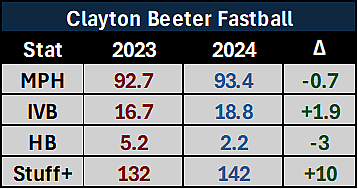 Last season, his fastball allowed a .419 wOBA while being barreled 13.2% of the time, and that means that Beeter would oftentimes fall behind in counts as he didn’t want to attack hitters with a pitch he knew would get hit hard. Triple-A is not a forgiving environment for pitchers, as the average ERA sat at 5.18 in 2023 as the level experimented with various versions of the Automatic Ball-Strike system and even the challenge system.