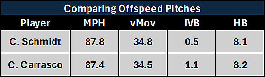For context, the changeup sample size for Carlos Carrasco is from 2019-2023, and while he hasn’t been a very effective pitcher across those five seasons, his changeup has remained excellent. It’s got a 32.8% Whiff Rate and .297 wOBA allowed over that timespan, and if Clarke Schmidt is getting similar results with his offspeed pitch, then the entirety of his arsenal gets that much better. It’s a huge development for him entering his age-28 season, and this could be the fix for his woes against left-handed batters.