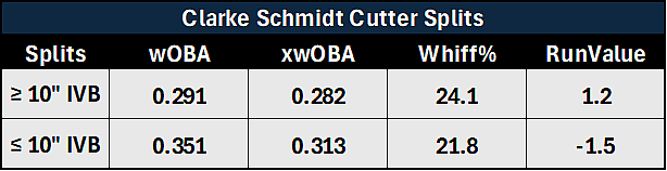 Focusing on the cutter, last season showed that when he can get more vertical ride on the pitch, he can miss more bats and barrels, resulting in more success and more confidence in the pitch. When looking at how his cutter performs at different vertical break profiles, there’s a massive discrepancy in success.