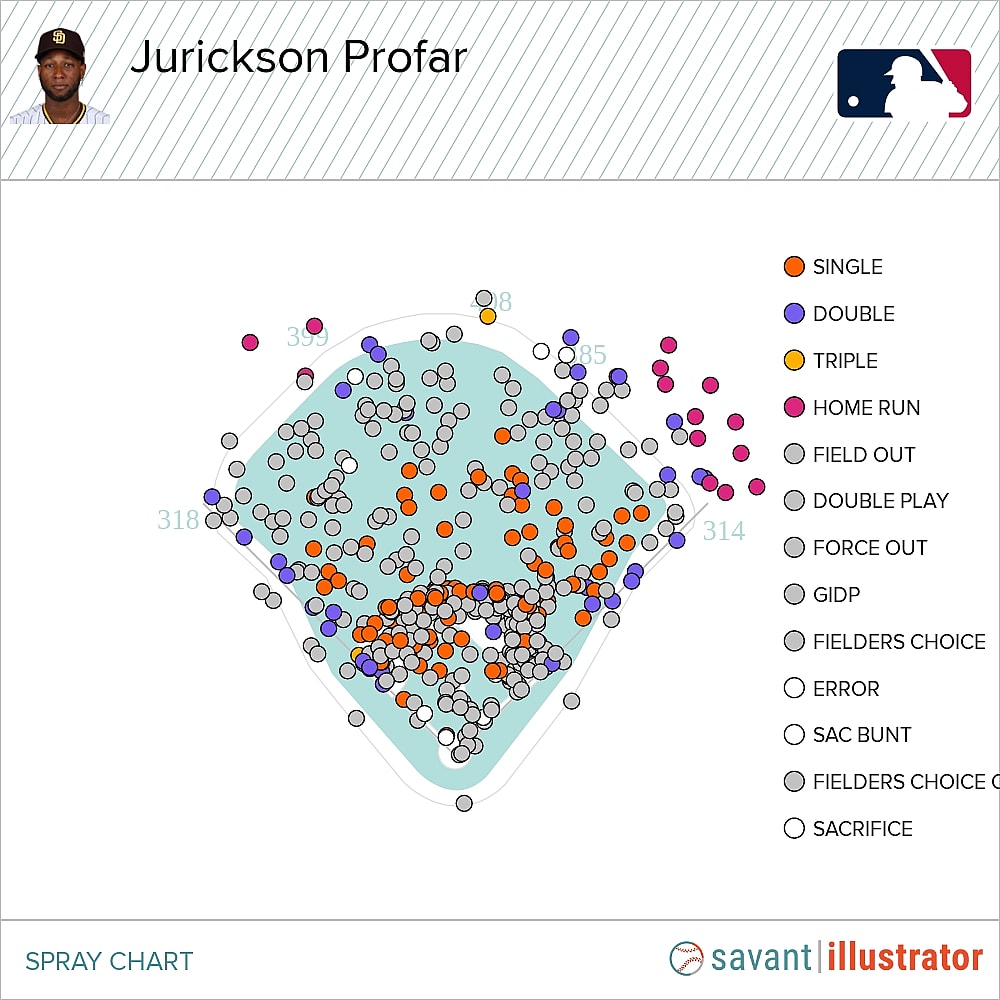 In 2018 and 2019, Profar hit 20 HRs twice, and those were notably the only years he reached the 20 HR plateau. He hasn’t slugged above .400 since 2020, which coincides with a new baseball that was “de-juiced,” leading to fewer HRs and the ball carrying a lot less. That being said, San Diego is also a notably poor ballpark for left-handed hitters to hit HRs in, with a 96 Park Factor compared to Yankee Stadium’s 118. Statcast’s Expected HR by Ballpark has Profar with 20 HRs in the regular and postseason instead of just 16, and that’s made evident by anyone who looks at his spray charts overlayed with Yankee Stadium.