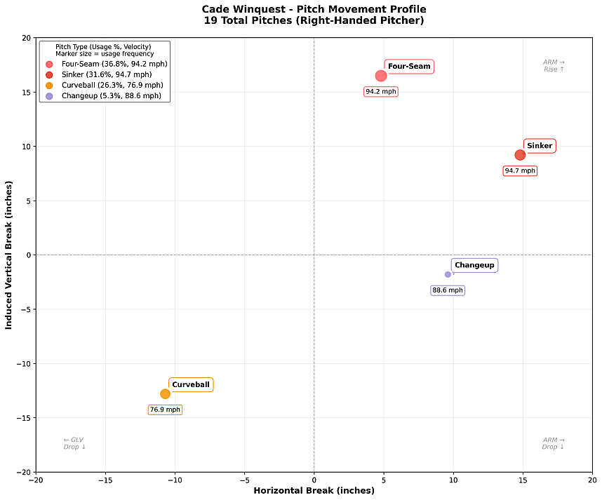 Cade Winquest made a lot of exciting changes that we saw today in action, but he needs to get the fastball back to that ~96 MPH range and find more shape consistency.