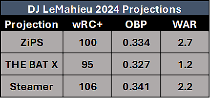 It’s hard to set expectations for DJ LeMahieu in 2024, as while you’d want a season similar to what he did after the All-Star Break, a 129 wRC+ projection would be unreasonable. One would hope that he improves on his 2023 numbers, but that’s not a universal opinion among projection systems, which are understandably lower on him than in years past. The ball is in LeMahieu’s court, he’ll have to prove himself to be the hitter that the Yankees say he’s capable of being, as that could change the dynamic of the Yankees’ lineup.