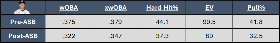 Everything got better across the board, and while it may be just a hot streak and blip in the radar, there’s also a chance that the adjustments stick. I don’t think Gleyber Torres is putting up a 144 wRC+ in 2024, in fact, his 80th Percentile OPS+ according to ZiPS is 136, so we’d be pushing into 90th Percentile territory with this ‘breakout’ and that’s a bit uncomfortable for me. Something around a 130 in either OPS+ or wRC+ would be where I think Gleyber Torres settles in 2024, and that would be the best mark of his career.