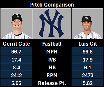 The velocity and vertical movement are essentially identical, and while Gerrit Cole gets a bit more horizontal break, the lower release height for Luis Gil makes his fastball move even better up in the zone. He’s flashing one of the best fastballs thus far in Spring Training, and various Stuff+ models grade it as one of the best in the game. The aforementioned changeup just takes his arsenal to the next level, and his ability to command three different pitches and generate strikeouts with all of them has boosted his profile significantly.
