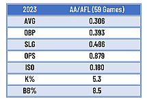 Given the Yankees’ increasing reliance on their farm system, Caleb Durbin’s success in the Arizona Fall League could earn him a promotion to Triple-A entering 2024. He played well after being promoted to Somerset, although he battled through two separate IL stints that limited him to just 47 games with the Patriots. Durbin slashed .291/.361/.440 in Double-A, and the big key here was the spike in SLG%. After slugging a career-best .397 with the Hudson Valley Renegades in High-A, he increased it to .440 and had his best ISO (.149) as well.