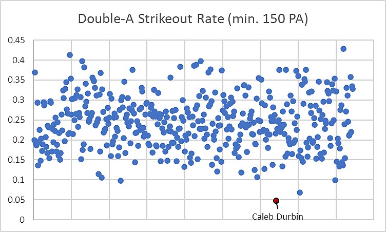 Caleb Durbin is an outlier among his peers when it comes to contact and swing decisions at the Double-A level, but it’s the sudden increase in power that’s suddenly shifted him from a limited hitter to somebody who could legitimately make a significant MLB impact at some point down the line. A shift in batted ball profile has done him wonders, generating a 41.5% flyball rate, a career-high that allowed him to hit for more power, and while that could seem like the Yankees forcing their hit-strikes-hard mantra on hitters, this has only improved the sustainability of Durbin’s profile.