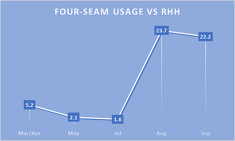 Likely as a way to keep batters honest and off of his changeup, Peralta began using his four-seam fastball prominently against right-handed hitters, and while it’s a small sample size, he held batters to a 41.7% Whiff Rate and .099 wOBA on that pitch this season. The pitch doesn’t get great vertical movement, as a show pitch it likely works as a way to change eye levels.