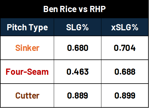 With three different iterations of a fastball, the total usage rate of those pitches combined sits at 62%, which works in the favor of Ben Rice.