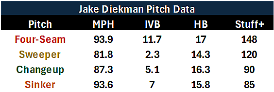 His 2.72 ERA and 2.30 FIP are extremely impressive, as he’s limiting damage contact against right-handed batters with an increased reliance on his curveball. Kikuchi may not carry the ace-level status that other names do, but he’s starting to find his place as one of the better starters in the American League. He’s getting a bit more vertical carry on his four-seamer and as a result has seen an uptick in Stuff+, with a balanced mix of secondaries that play off of it very well.