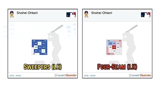 In the regular season and playoffs, Shohei Ohtani has a .102 wOBA against sweepers and a .342 wOBA against four-seamers from left-handed pitchers. The Yankees might be able to get an edge on the Dodgers with a left-hander who can throw four-seamers with good vertical life, as LA had the third-worst Run Value per 100 (-1.6) in the regular and postseason combined against LH four-seamers at or above 18 inches of IVB.