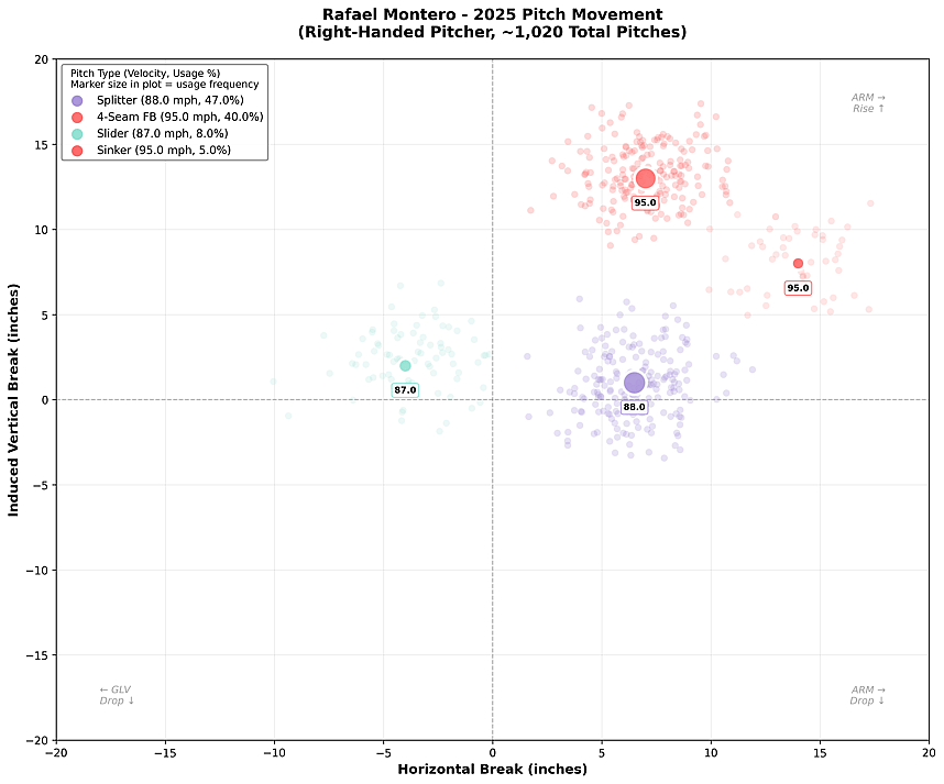 Becoming a two-fastball pitcher again might serve Montero well, his sinker had poor results but solid underlying metrics and grades out well in stuff models due to the combination of sharp drop and good lateral movement.