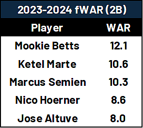 Acquiring one of the top second basemen in baseball would be the perfect way to address a serious hole in their infield, and while Nico Hoerner isn’t a great hitter, he’s posted a wRC+ at or above 100 in three straight seasons with an OBP of .341 over the last two years. His ability to run the bases well makes him a serious threat for pitchers to keep their eyes on when he reaches base as well, as he’s eighth in stolen bases (74) and BsR (11.8) over the last two years as well.