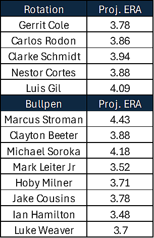 These projections aren’t nearly as pretty as the ones we saw for the offense, but I think they should be fine for the most part. If Roki Sasaki falls into their laps that would be great, but I don’t have much faith that the Yankees would invest significant financial capital in their rotation if they add Soto and a first baseman. Would have loved Nick Pivetta as a low-cost option but he got the Qualifying Offer so I would avoid him now.