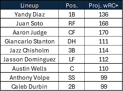 Perhaps the Yankees could get creative here, but I think going down a Luxury Tax threshold is more than enough for Hal Steinbrenner, they can’t cut costs too much since their bench depth was already a problem in 2024. Now that the roster is complete, let’s take a look at the lineup, rotation, and bullpen for 2025.