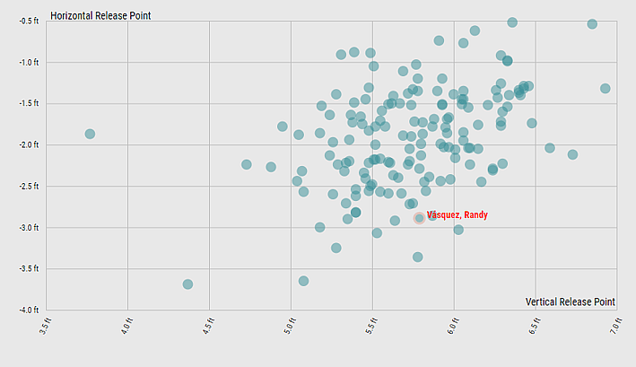 On average, cutters are released by right-handed pitchers at a horizontal point of -1.84 feet, but Vásquez releases his cutter at a -2.98, a dramatic difference that gives him an extremely unique release point for this pitch.
