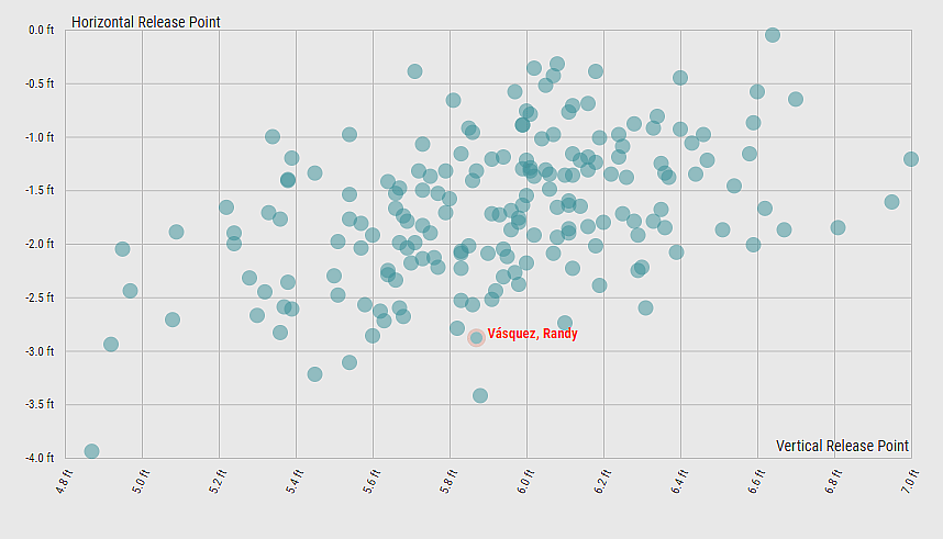 We again find that Vásquez has a unique release point for his curveball as well, with his horizontal release point explaining the abnormal amount of sweep on his curveball relative to the league-average one, which comes from a release that would generate more side spin.