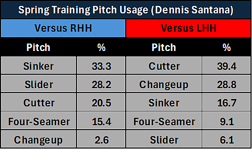 Now having five different pitches he can rely upon, he’s far more deceptive than he was in years past, and the ability to use so many different movement profiles should give him an advantage over most relievers. Not all pitches play well against all hitters and Dennis Santana seems to identify what he should throw to righties or lefties based on movement profiles and success.