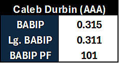 Caleb Durbin is running roughly average BABIP rates at a ballpark in Scranton where BABIP is slightly inflated, but the overall Park Factor there (95) would indicate that wRC+ is selling short his offensive contributions. You might be confused as to why a metric that’s intended to account for these discrepancies would struggle to capture park-adjusted offense, but FanGraphs doesn’t include Park Factor in its adjustment calculations. That means that not only is he not getting fat in unsustainable batted-ball luck, but he’s also being undervalued offensively.