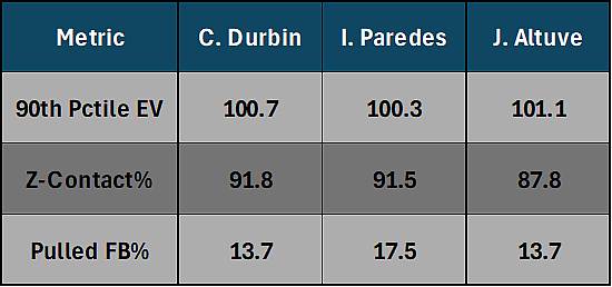 Caleb Durbin profiles very similarly to two titans in the pulled flyball game, having similar pulled flyball rates to Jose Altuve with a better hit tool, and while Paredes pulls the ball more often than both of them, he offers the second-best contact rate and the worst raw power of the trio. I don’t think Durbin will become the hitter these two have, it’s an irresponsible projection, but the upside of this archetype can certainly be rewarding.