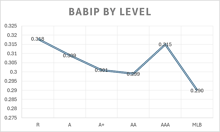 The only level where we see BABIP increase after a jump is Triple-A, and that’s because the baseballs used at that level best resemble the ones used in the big leagues. Adjusting to that ball can take time for pitchers, which is why their vertical ride (IVB) can be diminished in the first few outings at that level, thus meaning hitters have an advantage when they face a pitcher coming up for the first time that they normally would not have.