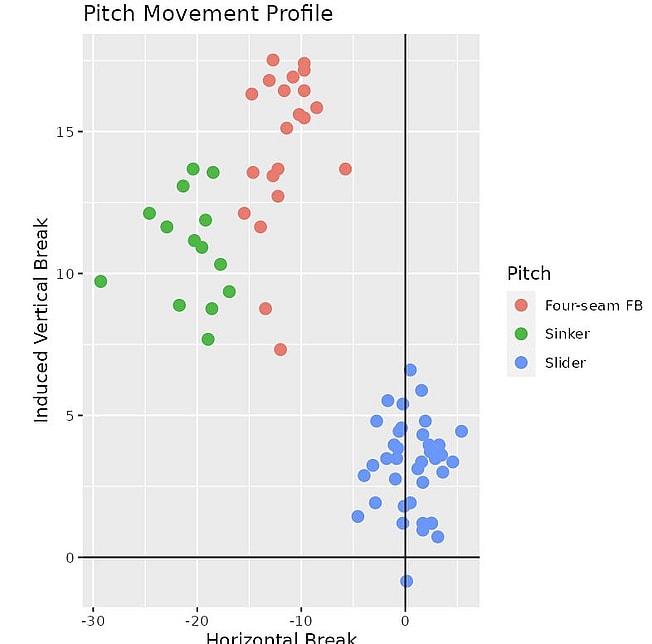 Ian Hamilton gets the requisite bullet spin we’re looking for, with a low spin efficiency that relies on seam-shifted wake instead of spin-induced movement. Seam-shifted wake is simply movement generated by how airflows react with the seams, something we typically see with sliders and cutters, but we also see this with changeups. This is where the fusion of these two pitches can come in, as both rely less on spin, and both pitches benefit most from vertical separation off of a fastball. The distinct difference comes in horizontal movement, as we typically see changeups run arm side with movement and sliders break glove-side, but for Hamilton, we see his slambio do both: