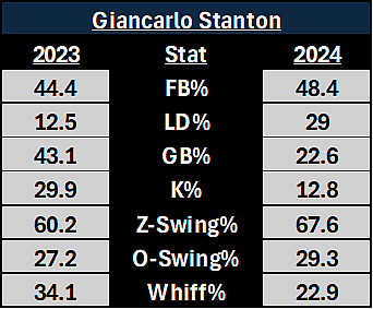 One of the other stunning revelations comes in the form of a decreased Whiff Rate, and while Anthony Volpe is the player we’re focusing on for contact increases, Stanton has arguably had the more impressive turnaround. We expect a hitter like Volpe to make a ton of contact, and it’s not uncommon to see an increase in contact rates for a second-year player, but Giancarlo Stanton has been infamous for the high strikeout totals. Again, these are small sample sizes, but if we can see an increase in both the quality and quantity of contact, that would go a long way as well.