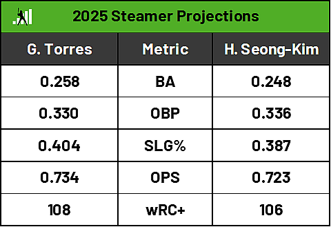 Steamer projections would agree; Gleyber Torres is a better hitter but the gap in production with the bat wouldn’t be massive. When you factor in baserunning value, it’s completely possible that Ha-Seong Kim ends up with more Offensive Runs than Gleyber Torres in 2025. Kim had more Offensive Runs this season despite playing just 121 games, and over the last three seasons trails Torres by just 0.4 Runs despite playing in 30 fewer games over that stretch.