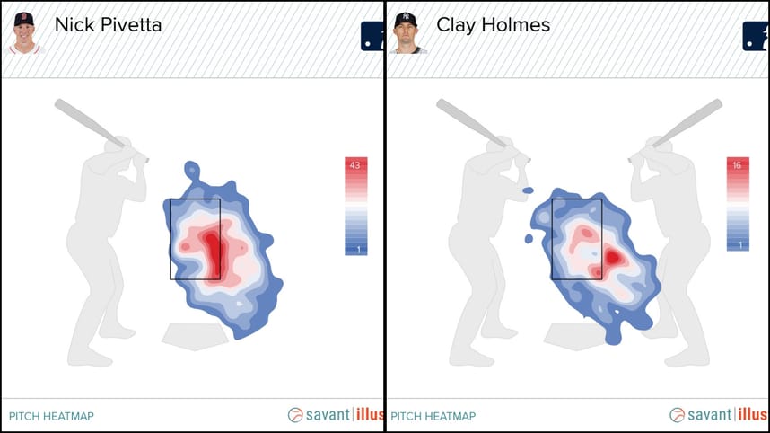 Clay Holmes also has a tendency to miss right down the middle, but most of his sweepers are missing down and away whereas Nick Pivetta’s sweepers stay up. With a high release point, both pitchers should be able to play up the vertical drop on their pitches since hitters are usually getting a steep angle downward, but only Holmes takes advantage of that to his best abilities.