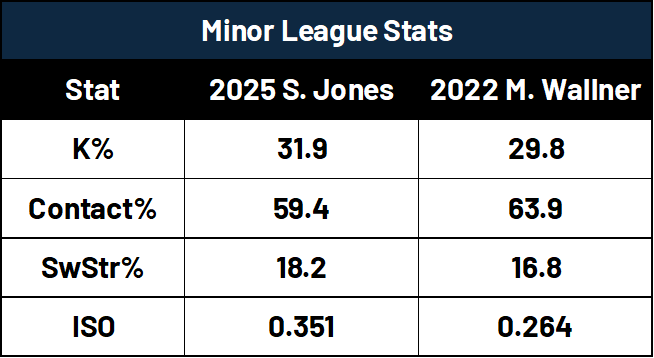 I’ve compared Spencer Jones to Matt Wallner multiple times throughout the offseason, as both were hulking outfield bats who needed more time in the Minor Leagues to find their footing. Injuries have limited Wallner’s effectiveness, but he has a 144 wRC+ and .847 OPS through his first 187 MLB games, which is superstar-level production at the plate. Both have serious strikeout issues. Wallner is very comparable to Joey Gallo when you look at just how frequently he swings and misses, and those issues were apparent through his final full year in the Minor Leagues.