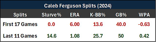 Throwing a new pitch in the middle of a season can be difficult, but after surrendering a grand slam on Mother’s Day against the Tampa Bay Rays, Caleb Ferguson would deploy a brand-new breaking ball. His slurve is a little bit firmer than his sweeper, but it has a sharper dropping action with less horizontal movement, making it a much better pitch against right-handed batters. He’s throwing his slurve 14.6% of the time over his last 11 outings, and the results are impressive.