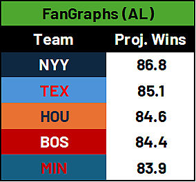 The lack of competition in the American League is great, but what’s more concerning is the fact that the Yankees are only projected to win 1.7 more games than the second-best team. All it takes is one injury to a player like Jazz Chisholm or Carlos Rodon for the team to slot behind the Rangers, who could add another reliever before things are all said and done. I mentioned Bregman for the Red Sox, who would certainly reduce the projected win gap to about 0.5-1, if not give Boston close to even odds at winning the AL East.
