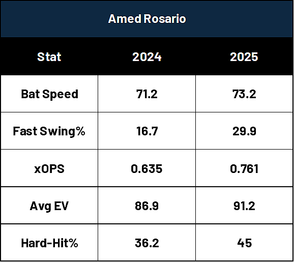 Improvements in his quality of contact where also paired with an increase in quantity of contact from 2024 to 2025, as Amed Rosario experienced a career-high in both xwOBA and Average Exit Velocity.