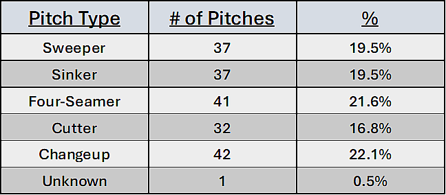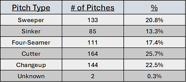 Pitchers that can command three fastballs can have their fastballs overperform their pitch grades since they tunnel extremely well, and batters oftentimes find themselves unsure which direction a fastball will take in flight when they don’t know which one they’re getting. He can still throw the sweeper backdoor or backfoot to lefties and go to his changeup for softer contact, but having command of five different pitches has made him an extremely well-rounded arm.