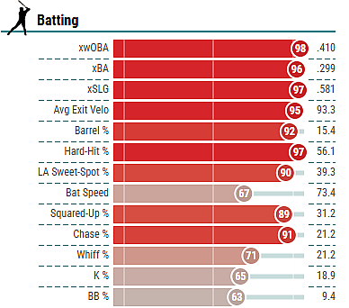 Statcast’s sea of red metrics on his profile tells the story of a hitter who knows exactly what he’s doing — and one who’s far from finished developing.