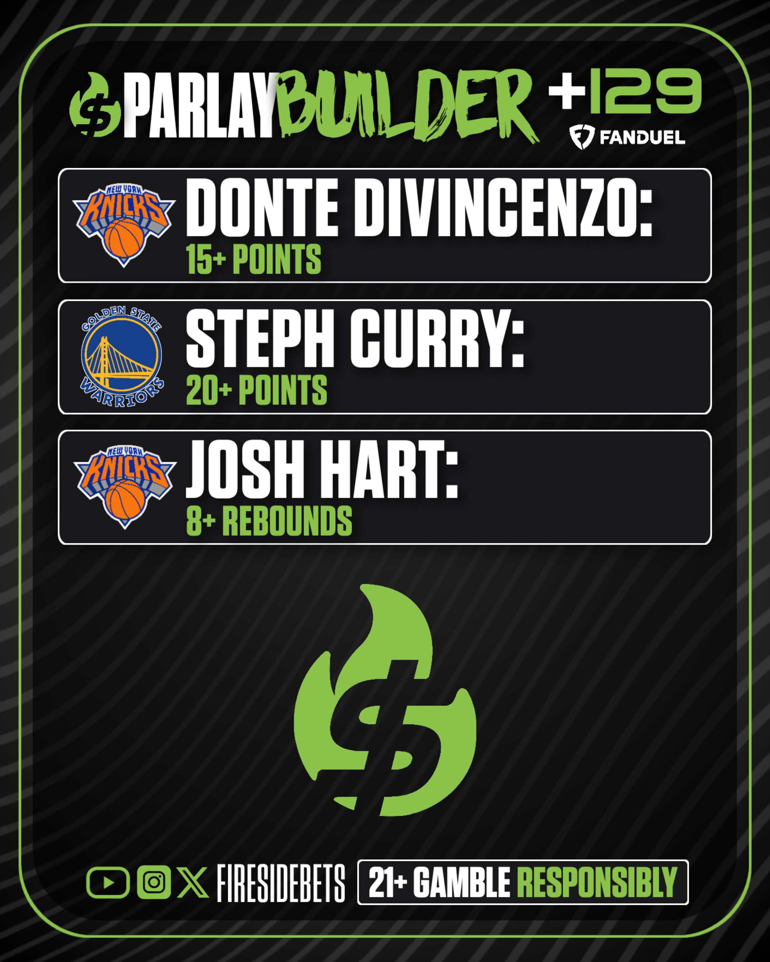 Donte DiVincenzo is one of the most aggressive and dangerous three-point shooters in the NBA, and since the injury to Julius Randle, he’s become their second option on offense. In that 20-game sample size he’s averaging 20.9 points per game and shooting over 12 threes a night, and against a Warriors’ team that struggles against guards, he could have a monster night and match or exceed that 15-point total.