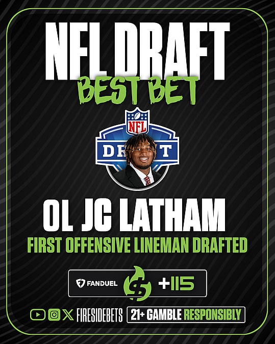 - First offensive lineman drafted: Alabama OT JC Latham (+115)